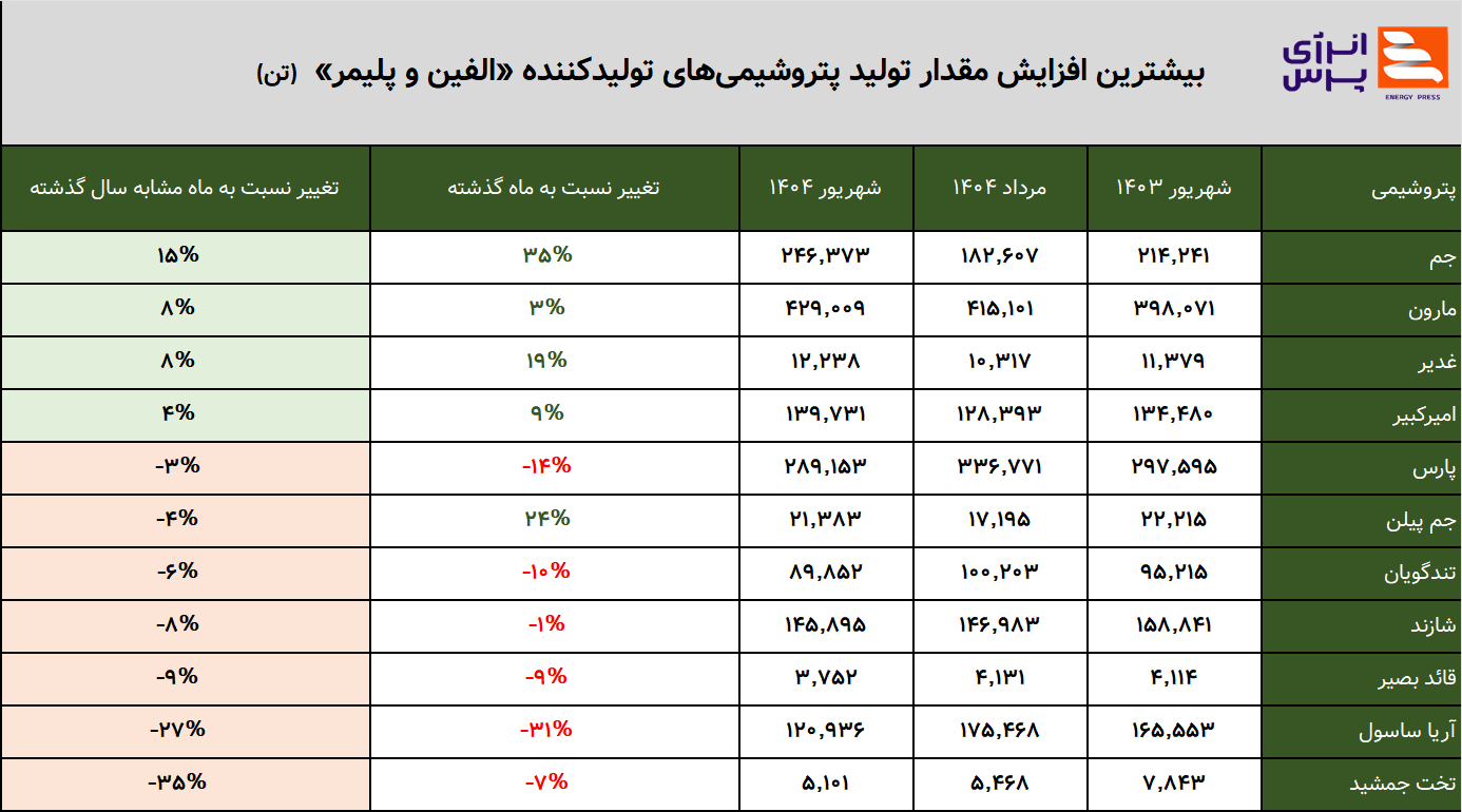 گفتنی‌ست ۱۱ پتروشیمی فعال در زمینه «الفین و پلیمر» در شهریورماه ۱۴۰۴ موفق به تولید یک میلیون و ۵۰۳ هزار تن از محصولات خود شده‌اند که در مقایسه با شهریورماه سال گذشته ۰.۴ درصد کاهش داشته است. همچنین این رقم نسبت به ماه گذشته یعنی مرداد کاهش بیشتر از یک درصدی را تجربه کرده است.
