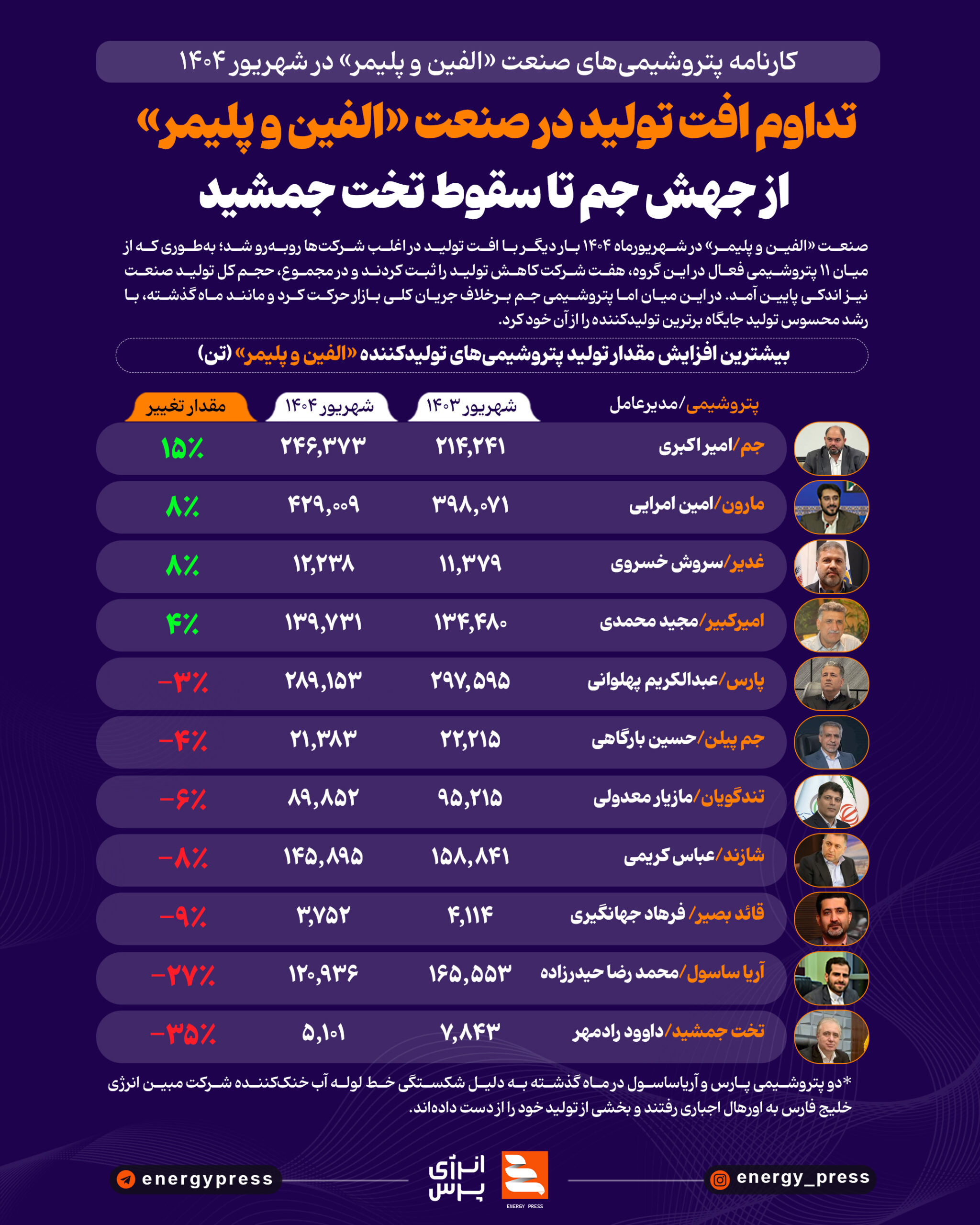 بررسی گزارش فعالیت ماهانه پتروشیمی‌ها فعال در این صنعت نشان می‌دهد، هفت پتروشیمی تخت جمشید، آریاساسول، قائدبصیر، شازند، تندگویان، جم پیلن و پارس به ترتیب بیشترین کاهش تولید را در شهریور ۱۴۰۴ نسبت به مدت مشابه سال گذشته ثبت کردند.