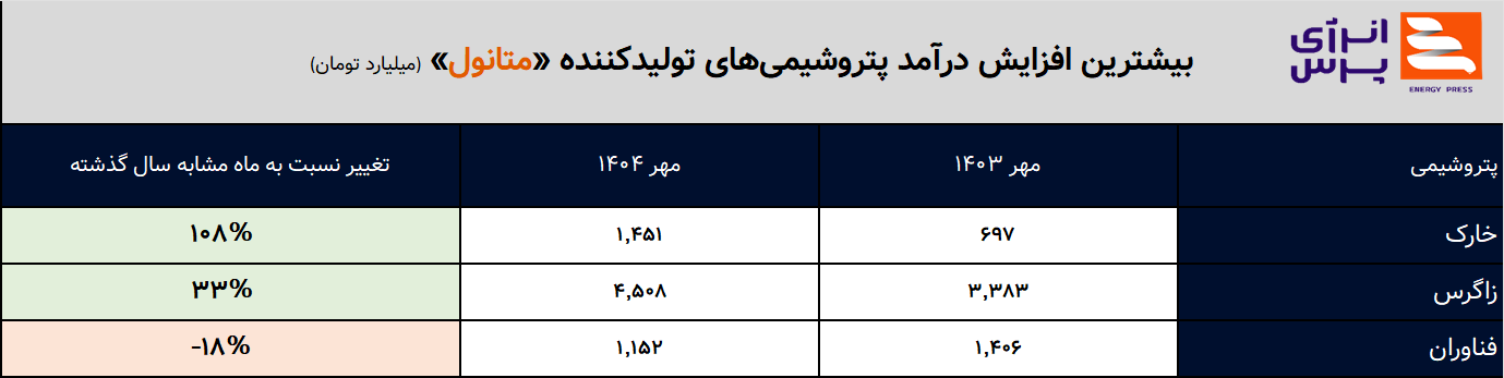 نگاهی به گزارش‌های فعالیت ماهانه پتروشیمی‌های متانول‌ساز بورسی در مهرماه نشان می‌دهد، دو پتروشیمی‌ این صنعت موفق به افزایش درآمد ماهانه خود نسبت به مهرماه سال گذشته شده‌اند.