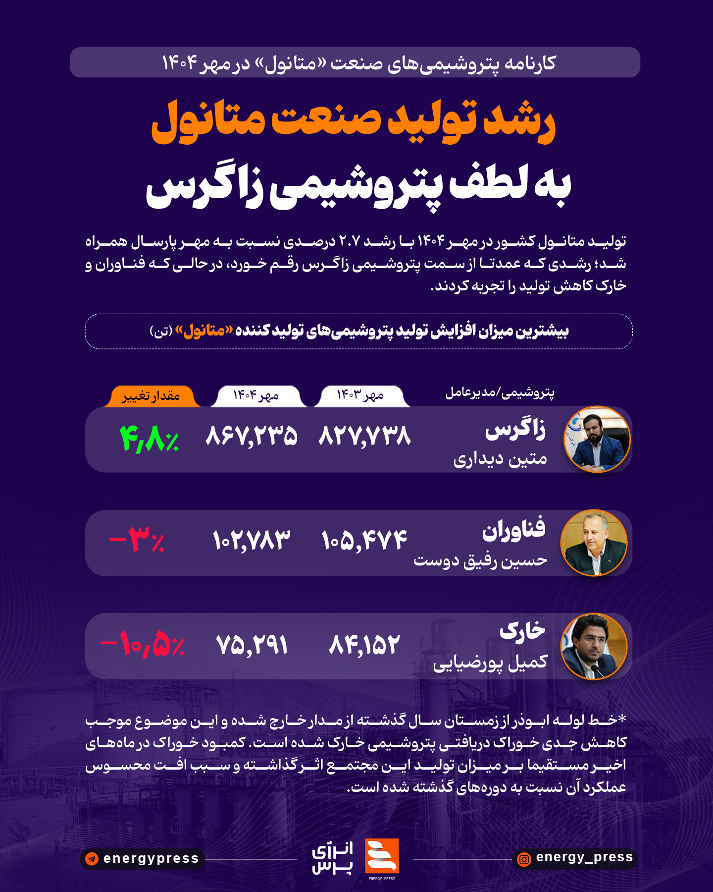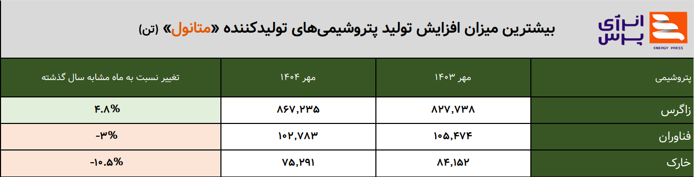 تولید صنعت متانول در مهر ۱۴۰۴ با رشد ۲.۷ درصدی نسبت به مهر پارسال همراه شد؛ رشدی که عمدتا از سمت پتروشیمی زاگرس رقم خورد، در حالی که فناوران و خارک کاهش تولید را تجربه کردند.