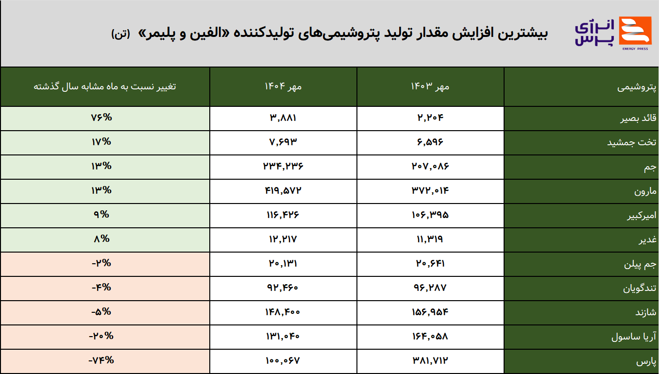 در میان تولیدکنندگان، «مارون» و «جم» با رشد ۱۳ درصدی در صدر الفینسازهای موفق قرار گرفتند و «تخت جمشید» نیز با رشد ۱۷ درصدی جایگاه خود را در میان برترینها تثبیت کرد. «قائد بصیر» نیز با جهش خیرهکننده ۷۶ درصدی در تولید، یکی از شاخصترین عملکردها را به نام خود ثبت کرد. در مقابل اما «پارس» با افت شدید ۷۴ درصدی در تولید، بیشترین کاهش را در کل صنعت تجربه کرد و «آریاساسول» نیز با کاهش ۲۰ درصدی، در پایین جدول قرار گرفت.