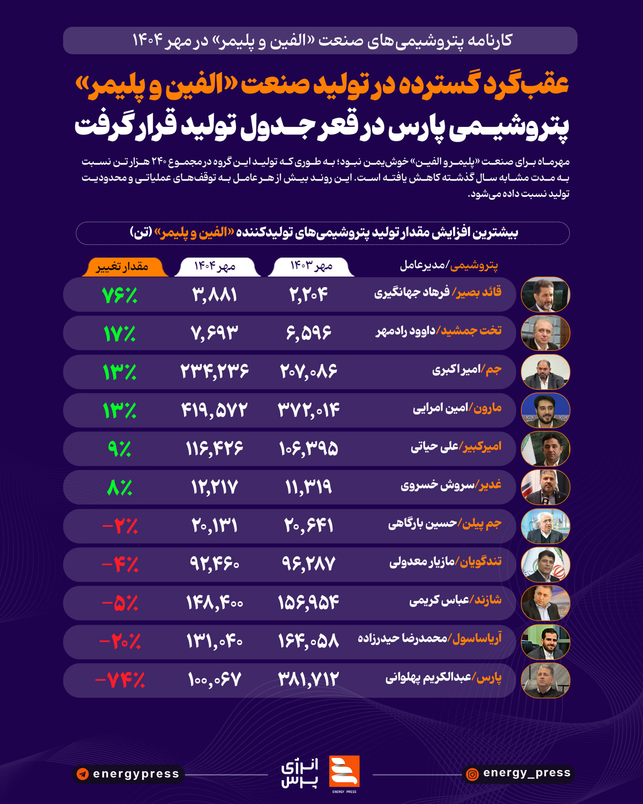 عقبگرد گسترده در تولید صنعت «الفین و پلیمر»؛ پتروشیمی پارس در قعر جدول تولید قرار گرفت +اینفوگرافیک