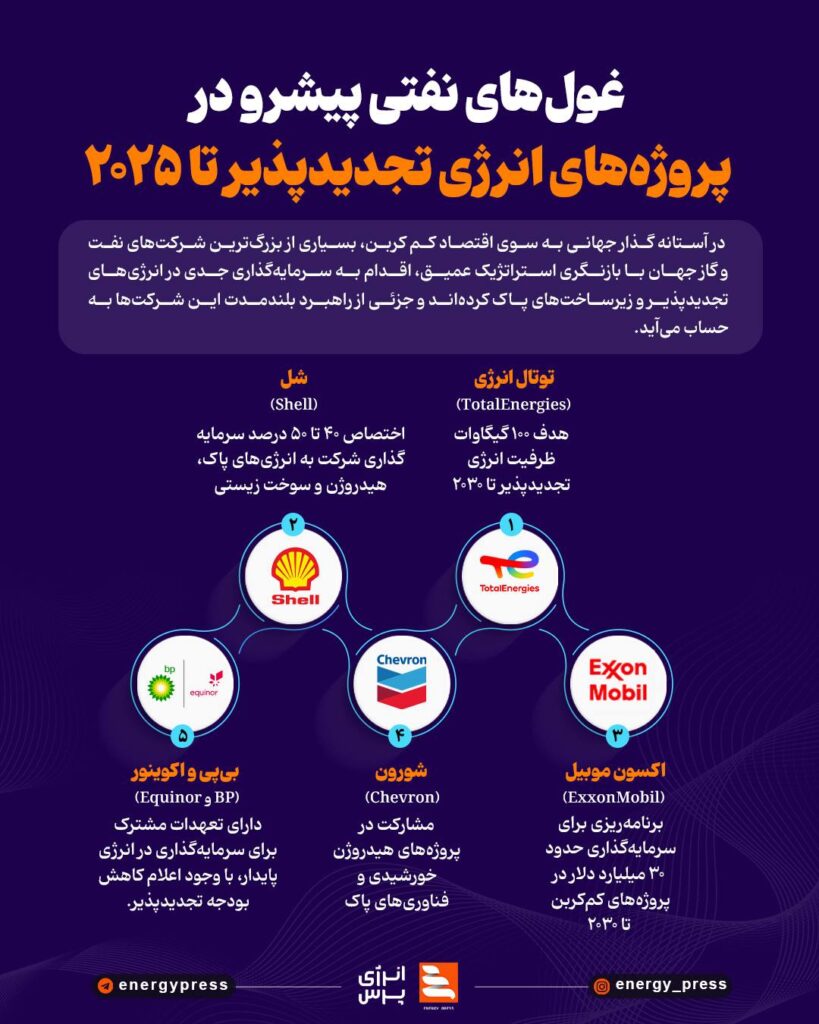 غولهای نفتی پیشرو در پروژههای انرژی تجدیدپذیر تا ۲۰۲۵ +اینفوگرافیک